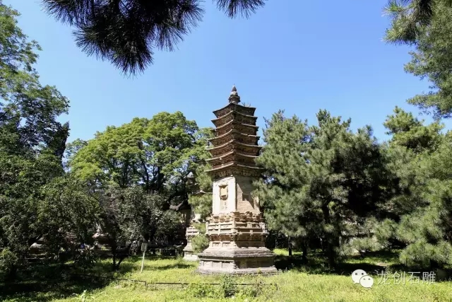 潭柘古剎,歷經(jīng)了十多個朝代,規(guī)模宏大,曾有難以數(shù)計(jì)的僧人在這里修行,并終老于此,因而在寺院附近留下了數(shù)量眾多的僧人墓塔。如今在寺前的塔林內(nèi)完好的保存著形式多樣的歷代佛塔七十余座。下塔院的塔林埋葬著金、元、明三代的部分高僧,塔形不一,種類較多,有石經(jīng)幢式塔、方形單層浮層屠式塔、密檐式磚塔和覆缽形藏式石塔。塔林中最高大的墓塔要數(shù)金代的廣慧通理禪師塔,此塔位于下塔院的中心,塔高九層,也是密檐式實(shí)心磚塔,塔前設(shè)有寬大的石供桌,塔前左右兩側(cè)還各有一株千年娑羅樹。