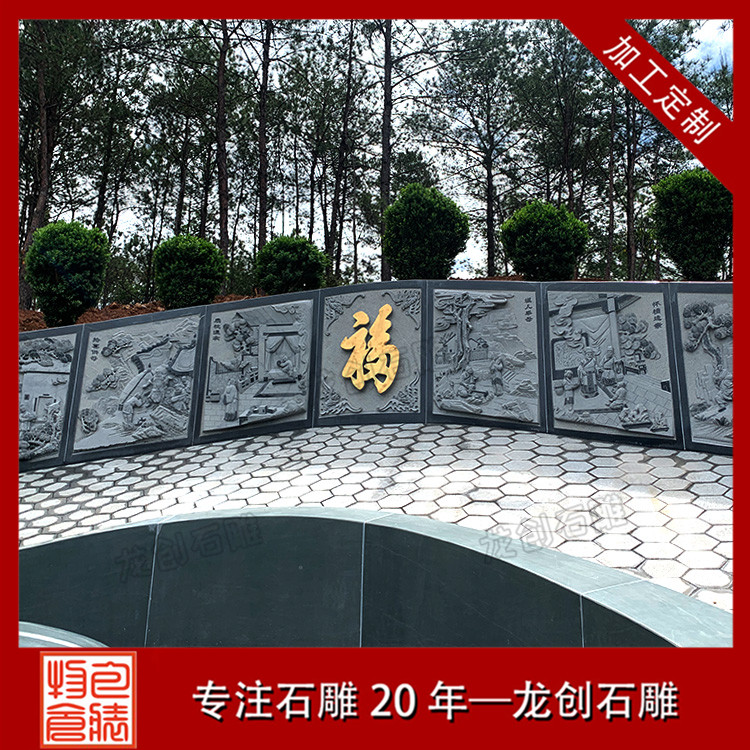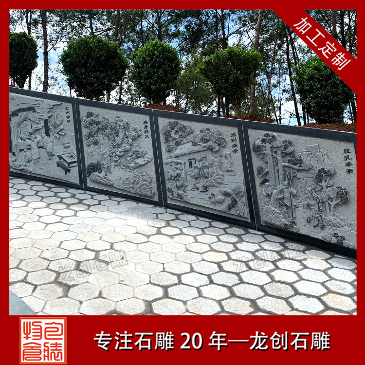 在墓園會使用到的石雕制品有很多,除了我們一開始會想到的石雕墓碑以外,還有些墓園會安裝石雕欄桿和石雕涼亭、石雕浮雕,墓園石雕欄桿除了起到安全防護作用外,還具有裝飾作用,而石雕涼亭的主要作用就是供人休息用的,石雕浮雕主要作用就是裝飾了,此套石雕墓圍的浮雕圖案是二十四孝。