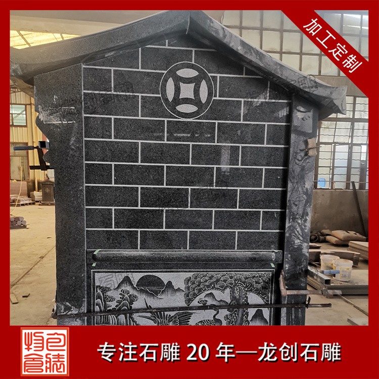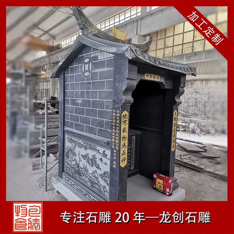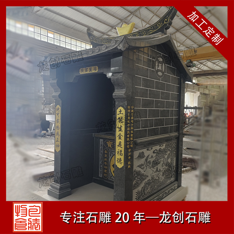 在浙江寧波的金蓮寺改造項(xiàng)目中,一座精美的石雕土地廟成為點(diǎn)睛之筆。這座土地廟采用優(yōu)質(zhì)芝麻黑654石材,質(zhì)地堅(jiān)硬,色澤溫潤。廟身的雕刻工藝精湛絕倫,高2.9米,寬1.36米,深度1.63米,整體造型古樸典雅,遵循傳統(tǒng)廟宇建筑風(fēng)格,飛檐斗拱線條流暢,比例協(xié)調(diào);墻體厚實(shí),雕紋精美,線條流暢。其內(nèi)部空間布局合理,土地神像安置其中,更顯威嚴(yán)。