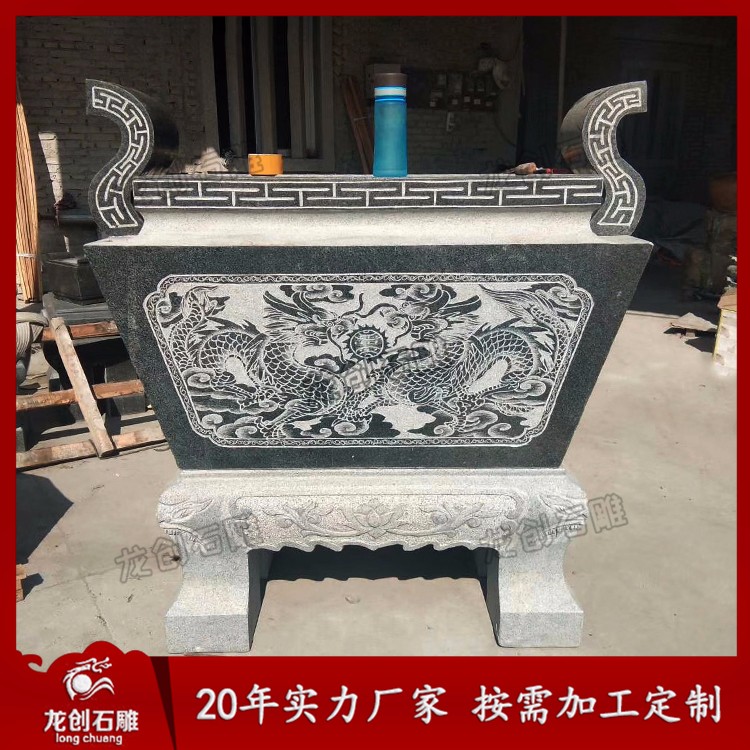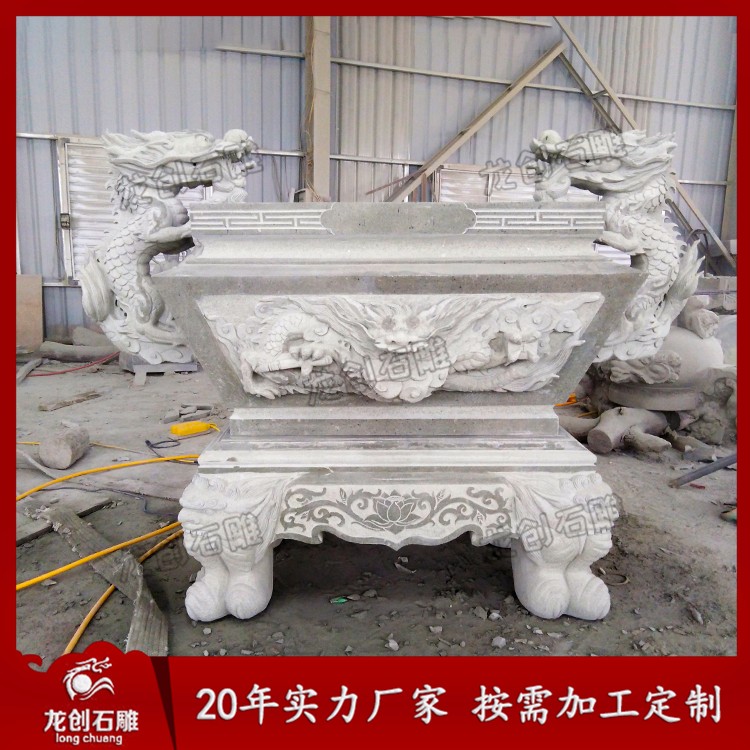 石雕香爐定做找龍創(chuàng)石雕,我司專(zhuān)注石雕工藝品二十余年,匠心制作、品質(zhì)保證。石雕香爐一般都用于日常供奉神明之用,寺廟石雕香爐的款式種類(lèi)有很多,大的、小的、方的、圓的、長(zhǎng)的、短的造型不一。通常會(huì)在爐身的四周雕刻龍鳳與祥云圖案,寓意龍鳳呈祥,陰陽(yáng)和諧。或者雕刻祥云花卉等圖案,雕刻技藝嫻熟的人雕刻出來(lái)的成品富有一定的靈性。