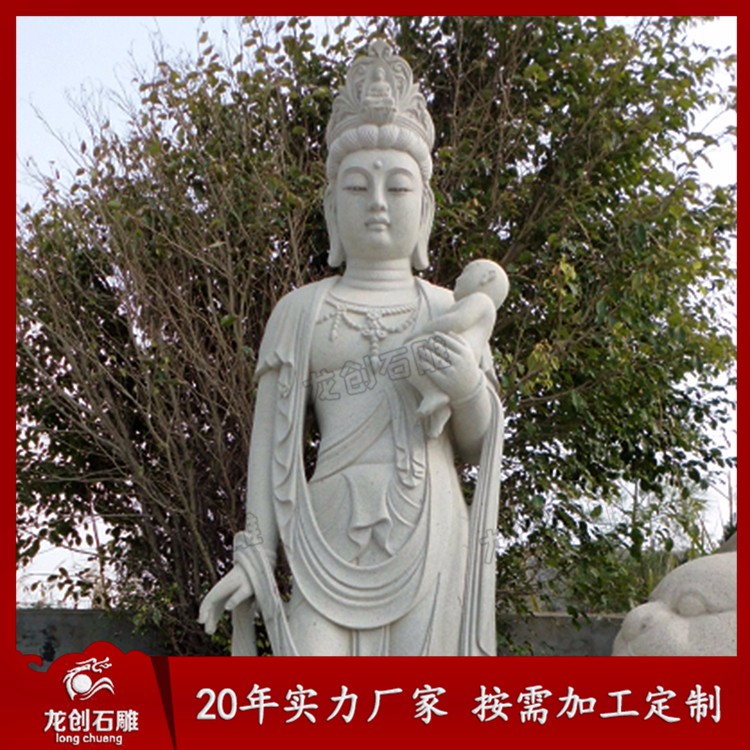 石雕送子觀音造型特點(diǎn),送子觀音懷抱男童,臉帶慈和微笑,寓意著早生貴子,添丁添壽。家中如果兒子媳婦結(jié)婚已久,仍未能懷上男丁,不妨安置一座送子觀音,祝愿早日能夠添丁發(fā)財。