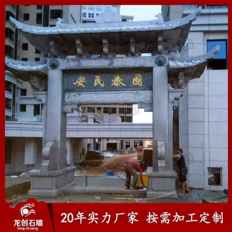 農(nóng)村村口牌坊要多少錢?這是購買石牌坊的客戶心中最想知道的答案,關(guān)于在農(nóng)村村口造一個牌坊需要多少錢?什么價格的都有,價格七八萬的有單門牌坊,十來萬的有一般的村口石牌樓,還有三十多萬的豪華石牌坊等圖片樣式,農(nóng)村牌坊石雕報價主要和圖片樣式、尺寸大小、石材、雕刻工藝有主要關(guān)系。