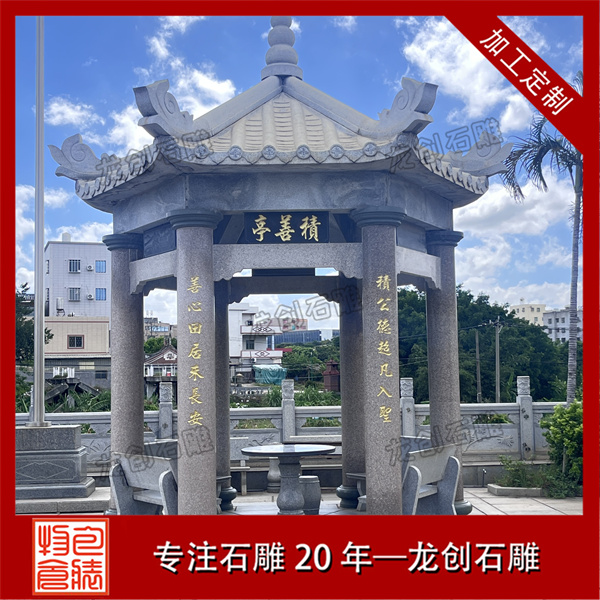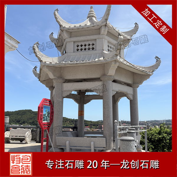 從工藝構(gòu)造來看,標準六角涼亭包含臺基、柱礎(chǔ)、檐柱、梁枋、屋面、寶頂六大組成部分。臺基常采用須彌座樣式增強穩(wěn)定感;六根檐柱通過精確的榫卯結(jié)構(gòu)與梁枋連接;屋面由六塊梯形石板精準拼接形成流暢的排水斜面;頂部寶頂作為收束構(gòu)件兼具裝飾功能。雕刻工藝以淺浮雕為主,常在柱礎(chǔ)處飾以蓮紋,欄板處刻有簡化的幾何紋樣或自然圖案,保持整體風格的協(xié)調(diào)統(tǒng)一。