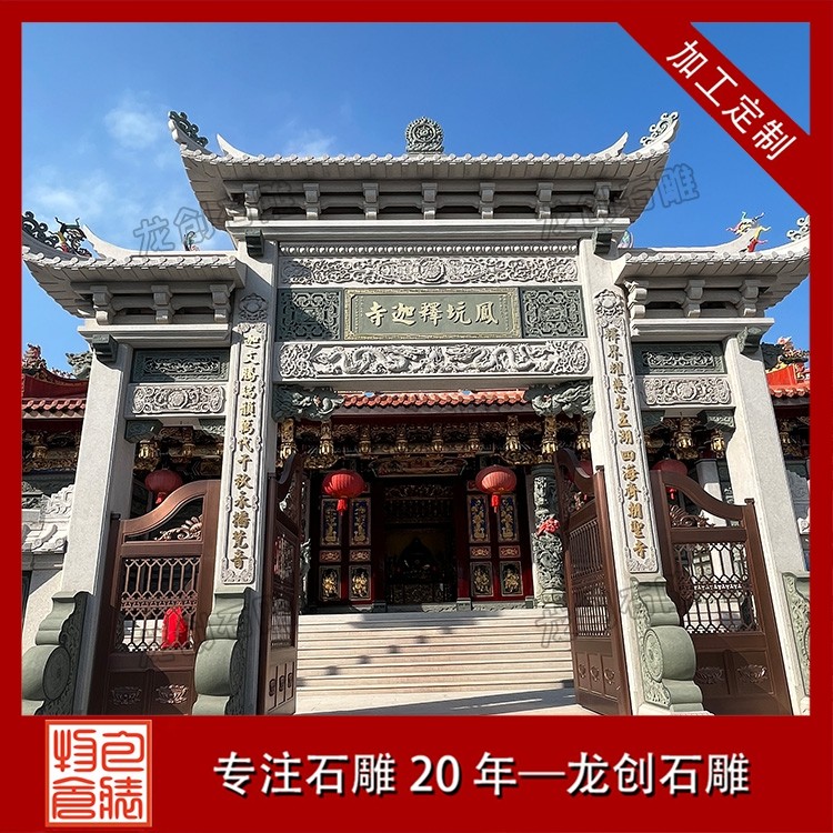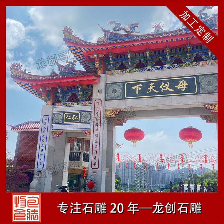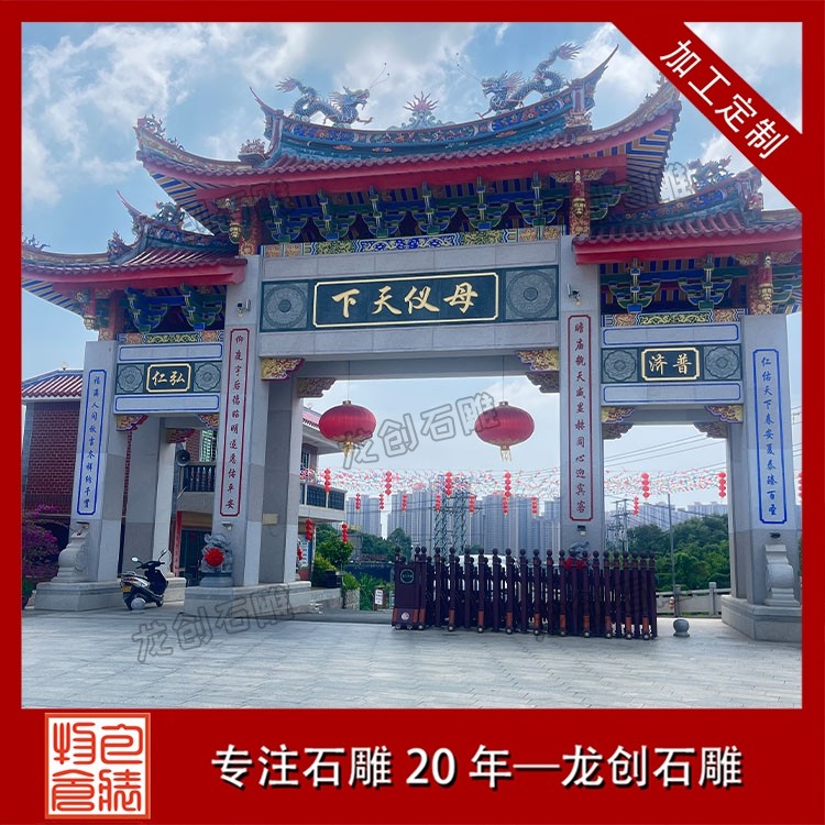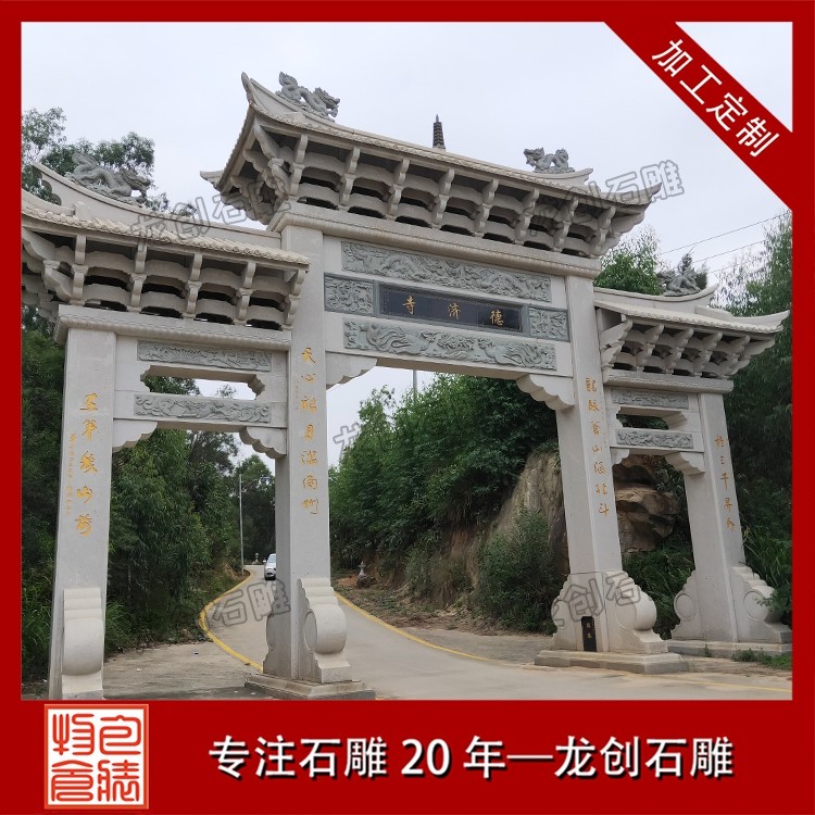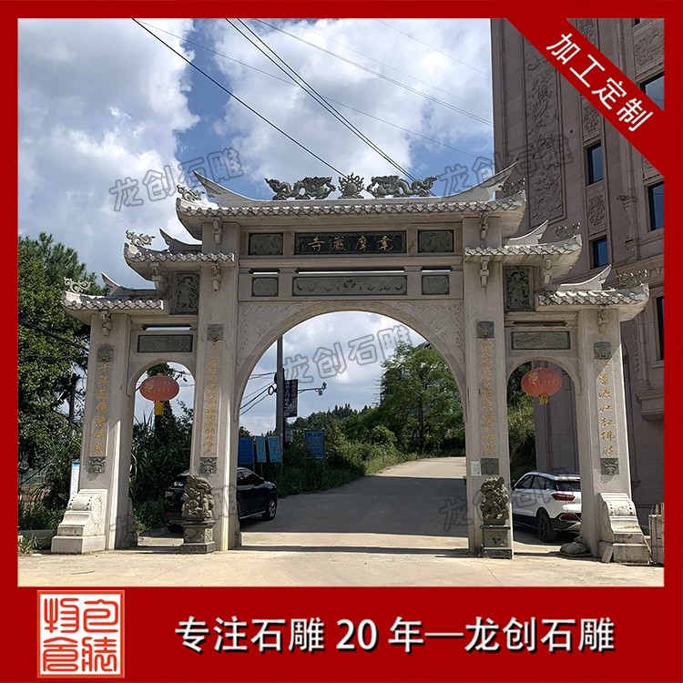 寺廟牌坊的風(fēng)格通常更為莊重古樸,色彩素雅,營(yíng)造出一種肅穆的氛圍。當(dāng)信徒或游客穿過(guò)牌坊的那一刻,仿佛從喧囂的俗世踏入了一片清涼圣境,世俗的煩惱被拋在身后,內(nèi)心自然而然地生出敬畏與虔誠(chéng) 。牌坊上的雕刻也極具宗教特色,常見(jiàn)的圖案不是凡間的飛禽走獸,而是具有佛教寓意的蓮花(象征圣潔)、八寶(象征吉祥) 等。它既是寺廟的標(biāo)志,也是引導(dǎo)眾生走向覺(jué)悟的精神前奏 。