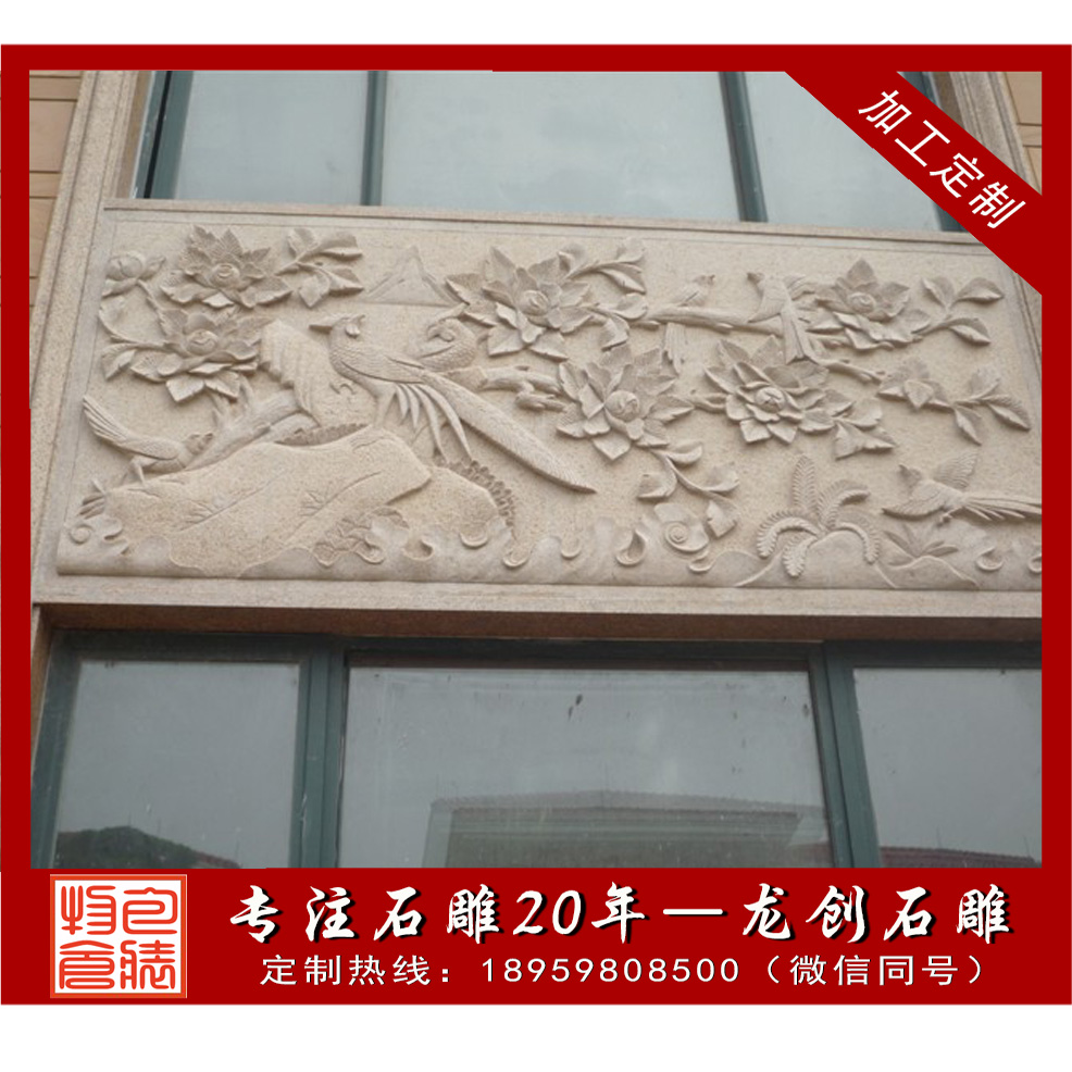 浮雕為圖像造型浮突于石料表面(與沉雕正好相反),是半立體型雕刻品。根據(jù)圖像造型脫石深淺程度的不同,又可分為淺浮雕和高浮雕。淺浮雕是單層次雕像,內(nèi)容比較單一;高浮雕則是多層次造像,內(nèi)容較為繁復(fù)。浮雕的雕刻技藝和表現(xiàn)體裁與圓雕基本相同。古今很多大型紀(jì)念性建筑物和高檔府第、民宅都附有此類裝飾,其主要作品是壁堵、花窗和龍柱(早期)及柱礎(chǔ)等。